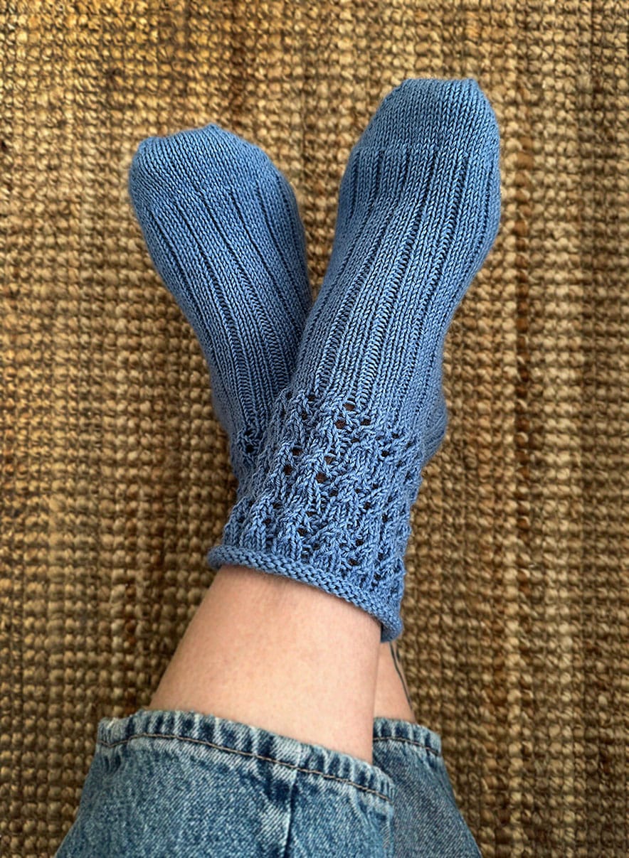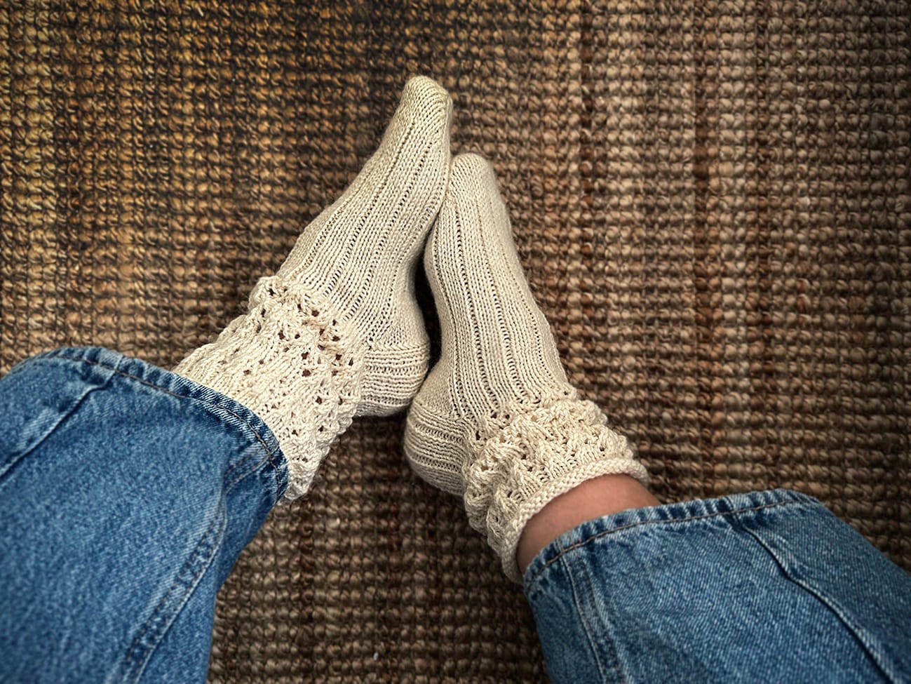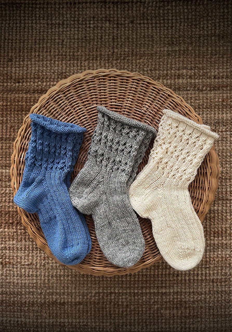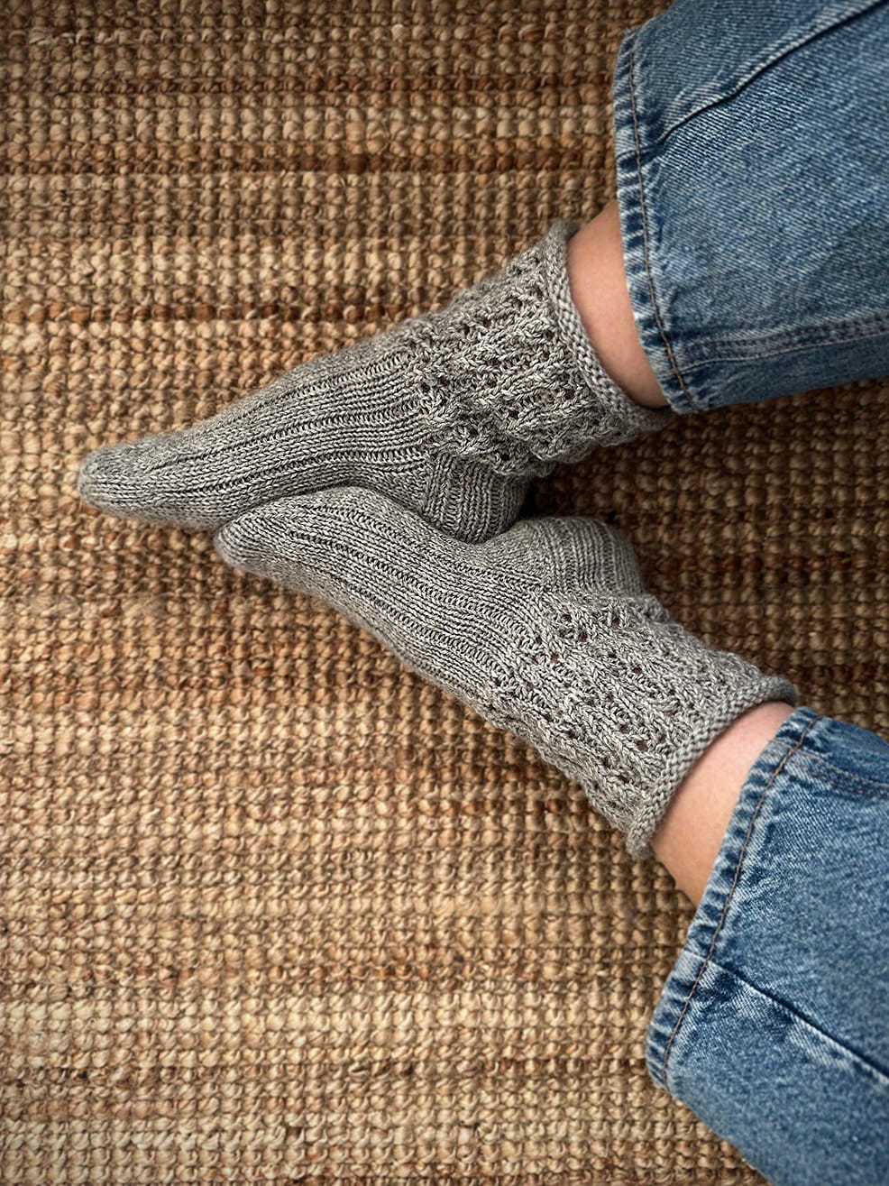 Den här versionen av Sockan Skuttunge stickas i ett lite kraftigare som t.ex. Lankava Mainio eller Järbo Mellanraggi (260 m/100 g). Det ger en varm, slitstark vardagssocka som passar fint i kängor och rymligare skor. Skaftet har en enkel spets/strukturstickning som du snart lär dig utantill. Mellan spetsvarven följer vilsamma resårvarv. Resåren fortsätter sömlöst över i häl samt ovansida fot. Och även under hålfoten finns ett parti resår – vilket ger extra komfort och gör att sockan sitter stadigt på plats!